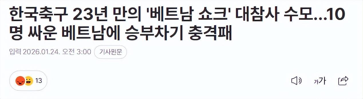 赛后,韩国媒体表示这是一个无法接受的结果。他们纷纷发文怒斥国家队创造耻辱。《朝鲜体育》表示:“在交锋历史上,韩国队一直都是压制越南队的。U23层面,双方9次交手,韩国队此前6胜3平。这是一场无法回避的史诗级惨败!”